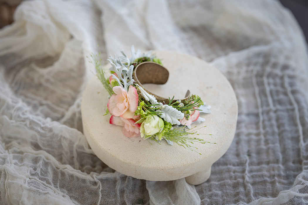 I craft my corsages on a polished brass cuff, giving them a touch of timeless luxury while ensuring they’re incredibly comfortable to wear. Far more than just wedding pieces, these floral adornments are perfect for a romantic night out, an intimate celebration, or any moment when you want to wrap your wrist in something beautifully unforgettable.